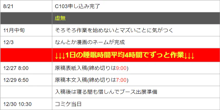 今回の『C103申し込み』~『コミケ当日』までのスケジュールを表にまとめてみた。